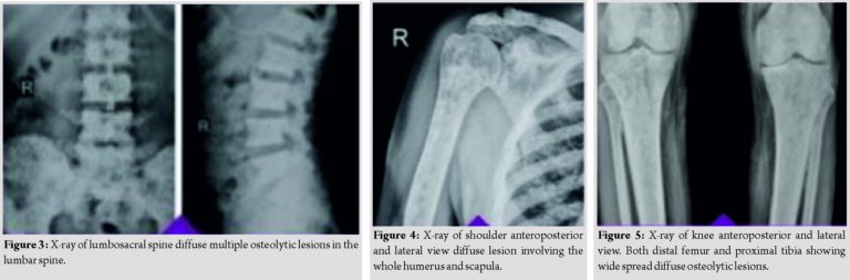 The patient then visited our tertiary center where the thorough skeletal survey was done, which showed involvement of pelvis (Fig. 1 and 2), spine (Fig. 3), and appendicular skeleton(Fig. 4 and 5) as well. The lesions were osteolytic, small, multiple, of varied sizes involving the whole of the involved bone, rather symmetrically (Fig. 6).