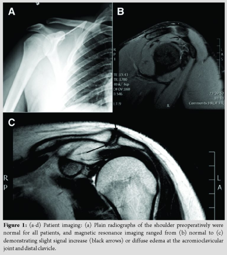 Radiographs were unremarkable and indicated no evidence of arthritis, fracture, or dislocation. The AC joint was normal or at the upper limits of normal (Fig. 1a). Magnetic resonance imaging (MRI) ranged from completely normal (Fig. 1b) to displaying significant changes about the AC joint, including hypertrophied tissue on the undersurface of the AC joint, distal clavicle marrow edema, and increased signal density between the thinned fibrocartilage disk and the chondral surface of the distal acromion (Fig. 1c). Other findings included one patient demonstrating a small amount of signal in the supraspinatus, suggesting a 2–3 mm partial thickness rotator cuff tear. Another showed mild increase in signal in the supraspinatus tendon with no evidence of a tear of the musculotendinous junction. This same patient had some slight signal increase in the anterior aspect of the superior labrum, but it was thought that this was more representative of the sublabral cleft representing a small tear without displacement. One patient with imaging data available had an incidental cyst beneath the posterior superolateral humeral head margin. All other available findings were otherwise normal.