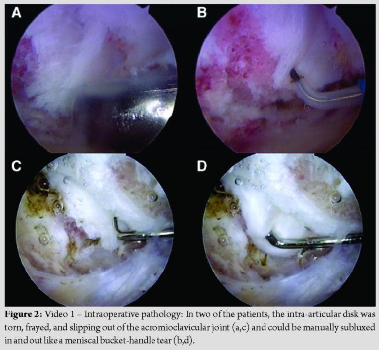 Arthroscopy for all patients was performed in the lateral decubitus position with a general anesthetic and interscalene block. The AC joint was approached through the subacromial space in all cases. When the arthroscope was placed, the bursa was noted to be thickened or inflamed in nearly half (3/7; 42.9%). After removing the inferior surface of the AC joint capsule, attention was paid immediately to the intra-articular disk which was found to have an acute tear (5/7; 71.4%) or degenerative/chronic tear (2/7; 28.6%) in all cases. Acute tears in the disk had clear margins with no fraying, fibrillation, or other signs of chronicity and were localized to the superior quadrant in one and centered in another. In two cases, the intra-articular disk was hypermobile and could be subluxed in and out of the joint (Fig. 2a-d; Video 1). All patients had soft tissue removed and their distal clavicles excised. Aside from AC joint disk pathology, one had a normal appearing biceps tendon, but with a secondary slip that was in continuity with the superior capsule of his shoulder. He also had a Buford complex. Another had some synovitis above the labrum at the superior aspect of his shoulder. One patient was found to have the superior labrum detached at the biceps anchor, but the rest of the labrum looked normal. The SLAP lesion was repaired with one suture anchor into the glenoid and with two sutures attached to it from the posterior and anterior biceps root to secure it down. The patient with minimal supraspinatus signal on imaging had delamination of the supraspinatus and about 15–25% biceps delamination and tearing. The rest of his biceps was intact. He also had some cracking in the posterior labrum. All other structures in these and the other patients were normal.