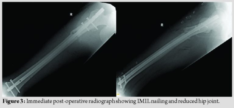 The patient was worked up for surgery immediately and emergency surgical intervention to reduce the hip was planned. After inducing anesthesia, no attempts of closed reduction using the various techniques to reduce the anterior dislocation were tried as the patient had an ipsilateral femur fracture because all the forces pass through the fracture site. Therefore, the patient was placed on a radiolucent table and with a help of image intensifier, under strict sterile precaution, initially, one 5 mm Schanz pin was placed close to the intertrochanteric region and used as a joystick to reduce the head into the acetabulum but was unsuccessful; hence, another Schanz pin was placed parallelly and connected with each other using a pin to rod connector and then the rod along with the pins was used as an external reduction tool to reduce the right hip in a closed manner without the need of open reduction, thereby reducing the chances of vascular insult on the capsule. The closed reduction was found to be satisfactory as checked under the image intensifier (Fig. 2) and further reduction of the subtrochanteric region was done and a uniplanar external fixator was applied as a temporary procedure. This emergency procedure was done within 6 h of the insult. After 2 days, the patient was taken up for definitive procedure in the form of external fixator removal and closed reduction and intramedullary interlocking nailing using a cephalomedullary nail but used as IMIL nail (Fig. 3) with the patient placed on a fracture table under C-arm guidance. Postoperatively, regular wound inspections and dressings were done and wound was found to be healthy.