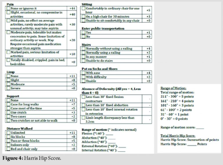 The patient was started on non-weight-bearing mobilization for 2 weeks initially and then was started on weight-bearing as tolerated and gently to full weight-bearing. The patient was also started on physiotherapy in the form of hip exercises at the end of 6 weeks. The patient resumed his daily work and had not faced any challenges. Functional assessment was done using Harris Hip Score (Fig. 4) at 6 weeks, 3 months, 1 year and 2 years follow-up.