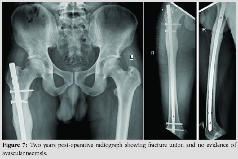 Radiological assessment was done at the time of 2 months (Fig. 5) and regularly until 2 years follow-up to check for fracture union and to rule out AVN of femoral head, secondary arthritis, and implant loosening.