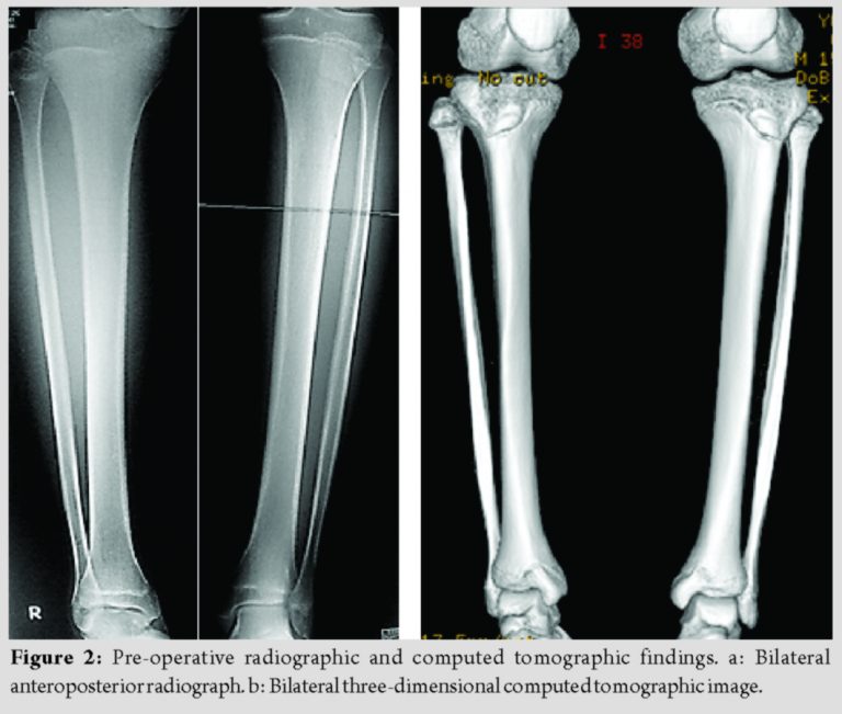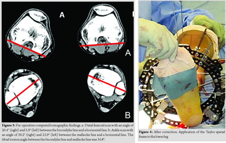 He had no leg length discrepancy at the time of surgery. His distal physis deformity as assessed by simple radiographic examination was characterized as follows: No coronal deformity, no sagittal deformity, and 31.0° external rotation. His rotational deformity as assessed by computed tomography was characterized by a tibial torsion angle of 65.6° on the right and 35.8° on the left (Fig. 2, 3).