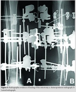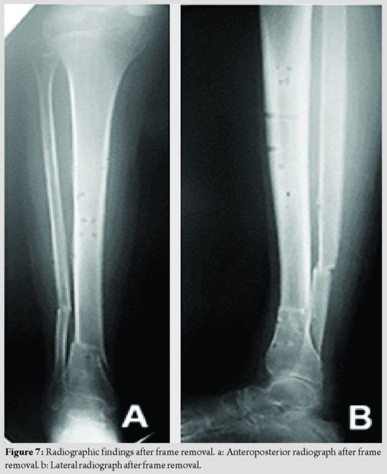 The frame fixation was stable, and the growth plate was preserved. Walking with weight-bearing on the operated leg was allowed immediately after surgery. One week later, the patient was able to walk without support. The hospital stay was 14 days long. After discharge, the patient was allowed to walk without crutches and reported a good quality of life with the TSF. Radiographs showed healing of the osteotomy at 76 days postoperatively (Fig. 5).