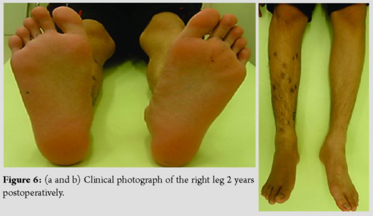 The frame was removed at 86 days postoperatively, and anatomic and functional correction was confirmed (Fig. 6). Two years postoperatively, the patient exhibited no leg length discrepancy or rotation malalignment of the lower extremities as measured both clinically and radiographically (Fig. 7).