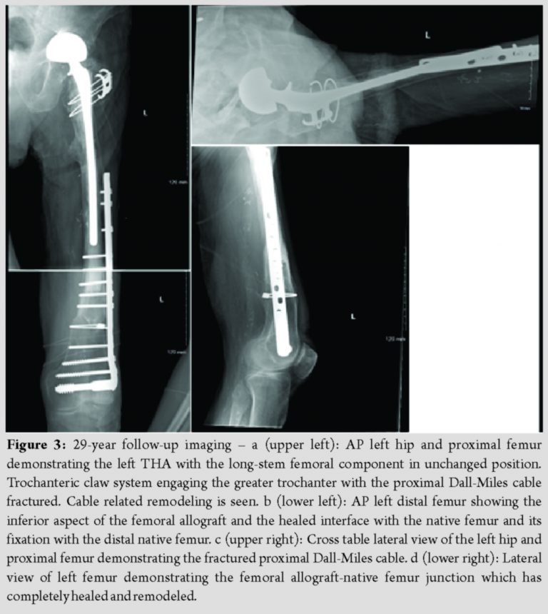 PD is a relatively common metabolic bone disorder with significant morbidity [9,10]. There are three classic phases of PD: Osteolytic, mixed osteoblastic/osteolytic, and sclerotic [11]. While these phases typically occur in sequence, they may be present in different phases at different bone sites. Most often, PD presents with singular bony involvement, though it may involve multiple bones. While PD may be asymptomatic, patients commonly present with bone pain, deformity and even fracture [3]. Orthopedic intervention is indicated in a variety of clinical scenarios including impending pathologic fractures, deformity correction, fracture fixation, and complex post-traumatic reconstruction, as demonstrated in this case [12,13]. Because PD is associated with a marked increase in vascularity within the involved bone, bisphosphonate therapy is recommended for at least 6 weeks before surgery to prevent excess blood loss [12]. Massive bony allografts present unique patterns of healing, varied with junction composition (cortical-cortical, cancellous-cancellous, and cortical-cancellous) [14]. While union rates in cortical-cortical junctions occur more slowly, cancellous bone heals more rapidly as native bone develops an internal callous, invading the allograft [14]. In this case, the distal allograft native femur junction was 2 cm × 2 cm of cortical-cancellous bone. Within a few years post-operative, the junction had completely healed with no visible junction line, an atypical finding. It is likely that the increased vascularity and osteoblastic activity inherent to PD accelerated this healing period [13,15]. This same osteoblastic activity may explain the PD from the native periosteum invading the medial cortex of the allograft resulting in the peculiar “spike” of the bone appearance. This is another finding not typically seen in allografts, except in cases of infection of chronic inflammatory states [14]. At 29 years post-operative, there was no loosening of the cement mantle around the stem. As reported by Enneking and Mindell, this is likely an advantage of the paucity of revascularization and subsequent bone resorption that is seen in the central canal of massive allografts [14].