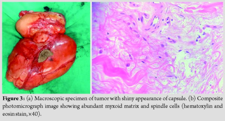 Myxomas were first described by Stout in 1948. Soft tissue myxomas consist of a group of mesenchymal tumors that are characterized by the abundance of extracellular myxoid matrix [1]. Myxoid tissue comprises a gelatinous mucopolysaccharide matrix of sulfated and non-sulfated glycosaminoglycans [2]. Based on radiological and histopathological findings, benign myxomas are further divided into intramuscular myxoma, aggressive angiomyxoma, superficial angiomyxoma, myxolipoma, dermal myxoma, and acral fibromyxoma [2]. The slow growth of the lesion is an essential attribute. Myxomas are usually seen in the 4th–6th decades of life and can attain relatively large sizes, as seen in many soft tissue sarcomas, making it difficult to distinguish from them [3]. En masse excision is the definitive treatment modality and no adjuvant or neoadjuvant therapy has been advocated in the literature.