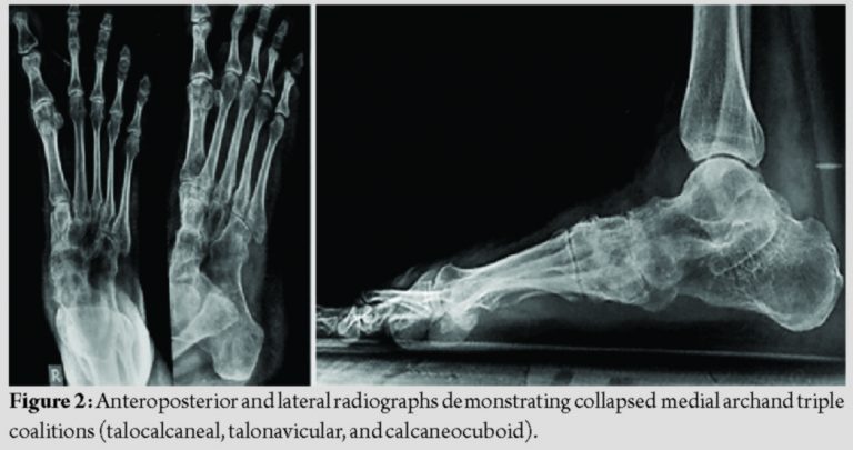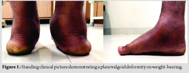 A 24-year-old female patient presented with complaints of painful deformity of her right foot with marked restriction of activities. Over the past 2years, she received conservative management in the form of medications, physiotherapy, and orthotics without any relief. Clinical examination revealed a planovalgoid foot along with a tight gastrocnemius, with a preserved ankle range of movements (Fig. 1). The subtalar and transverse tarsal joint movements were absent, along with tenderness over the subtalar, talonavicular, and calcaneocuboid joints. The diagnosis was confirmed with standing radiographs. Radiographs demonstrated the congenital fusion of subtalar, calcaneocuboid, and talonavicular joints with heel in valgus (Fig. 2).