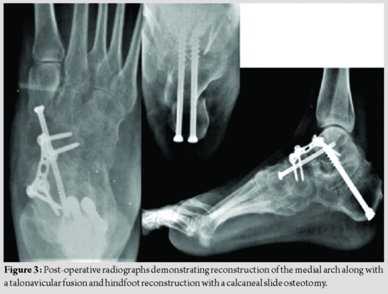 The osteotomy was fixed with two 6.5 mm cannulated cancellous screws, pushed through the subtalar joint up to the neck of the talus. Finally, to correct the sag at the talonavicular joint, a dorsal open wedge osteotomy was carried out at the level of the talonavicular joint, packed with iliac crest bone graft and fixed using a plate, and screws to restore the medial arch (Fig. 3).