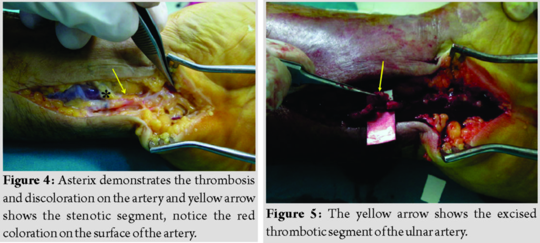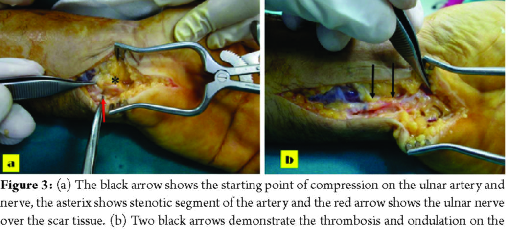 The patient had symptoms of paresthesia and severe pain on the 4th and 5th fingers at 10th-day follow-up after the procedure. He was closely monitored, as current symptoms did not improve, and electromyographic examination was obtained at the 4th week postoperatively. The electromyographic analysis revealed severe partial ulnar nerve injury. The surgical exploration of the nerve was decided. Approximately 10 cm incision was made on the ulnar aspect of the wrist’s volar part. The ulnar nerve and the ulnar artery were found trapped inside the scar tissue (Fig. 3).
