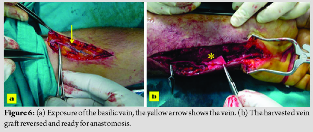 The compressed ulnar nerve was released. Intimal injury and consequent thrombosis were observed at the ulnar artery. The thrombosed segment was excised till to the edge of the healthy vascular intimal layer (Fig. 4). As the defect was approximately 5 cm, an anastomosis was planned with a vein graft from the forearm. About 8 cm of skin incision was made on the forearm’s volar side, 10 cm below the elbow joint, and 6 cm of vein graft was harvested from the basilic vein, reversed, and the defect was repaired with the graft (Fig. 5-7). The ulnar artery was also decompressed against the probability of further compression. Four weeks after the second operation, finger hypoesthesia started to improve, and clinically, the pain diminished, and wrist and hand functions became better (in complete comparison). The patient had full functionality and pain-free wrist without any neurovascular impairment; after the 8 months from the second surgery (Fig. 8-10).