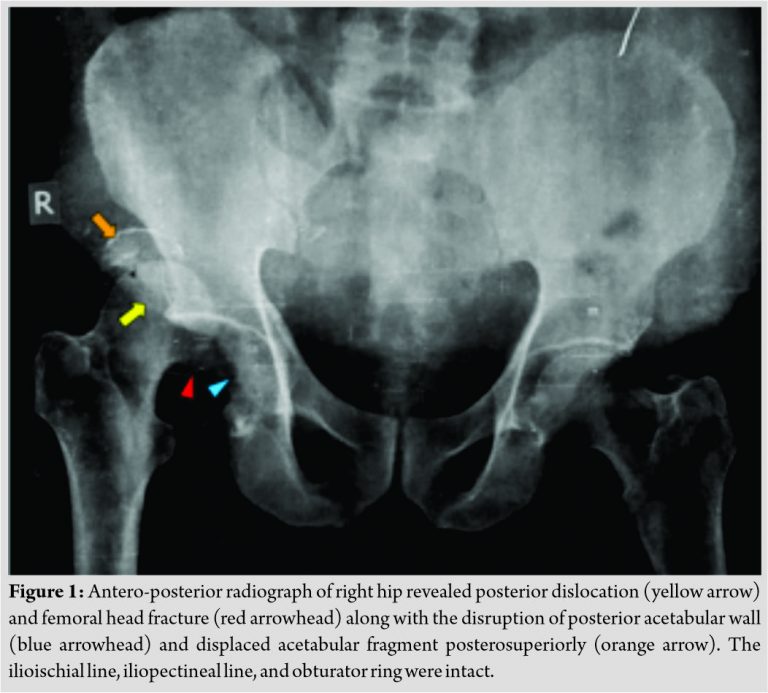 In 2015, a 60 years old male patient presented to the hospital with complaints of pain and swelling in right hip region and inability to bear weight on right lower limb for 15 days. Patient had history of motor vehicle accident and sustained injury to the right hip region. He had not taken any treatment previously and presented to us for the 1st time. On clinical examination, right lower limb was adducted and internally rotated. Movements at right hip joint were painful and restricted. Swelling was present in right gluteal region and vascular sign of Narath was positive. Distal neurovascular structures were intact. Radiograph of right hip revealed posterior dislocation and femoral head fracture with a large intra-articular fragment. There was disruption of posterior acetabular wall with a displaced acetabular fragment posterosuperiorly. The ilioischial and iliopectineal lines were intact as was the obturator ring. The femoral neck was also intact (Fig. 1).