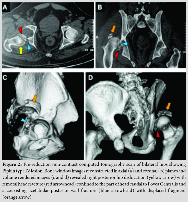 Pre-reduction non-contrast computed tomography scan was performed for further evaluation. Images were reconstructed in bone window and volume rendered images were also obtained. The study confirmed the findings of radiography and revealed right posterior hip dislocation with femoral head fracture confined to the part of head caudal to Fovea Centralis. There was a coexisting isolated acetabular posterior wall fracture. Hence, the lesion was classified as Pipkin type IV (Fig. 2).