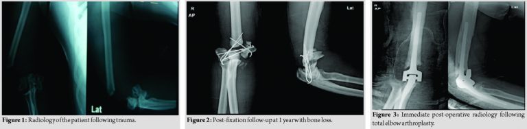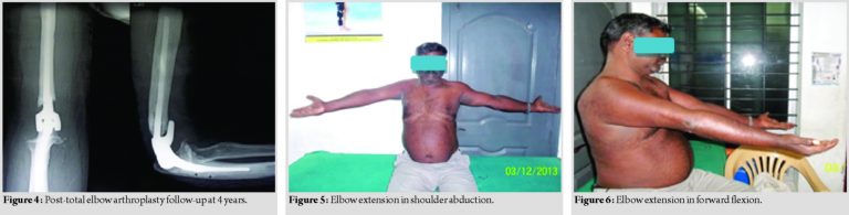 Case Report: A Fifty one years old sedentary male presented to our institute with a history of injury to the right elbow (sideswipe injury). On clinical and radiological examination, it was open Grade III B fracture of distal humerus with bone loss. He was treated with wound debridement and initial temporary fixation with k-wires and later soft-tissue reconstruction. One year later, the patient upper limb was flail, limited range of motion (passive 40° 70°) and no infection. Radiology revealed non-union of condylar fragments with bone loss of distal humerus. The patient underwent TEA through standard triceps reflecting approach. He was implanted cemented modular Coonrad-Murray semi-constrained prosthesis Type III. The post-operative period was uneventful. At 4-year follow-up, the patient is pain free with elbow range of motion 5°120°.