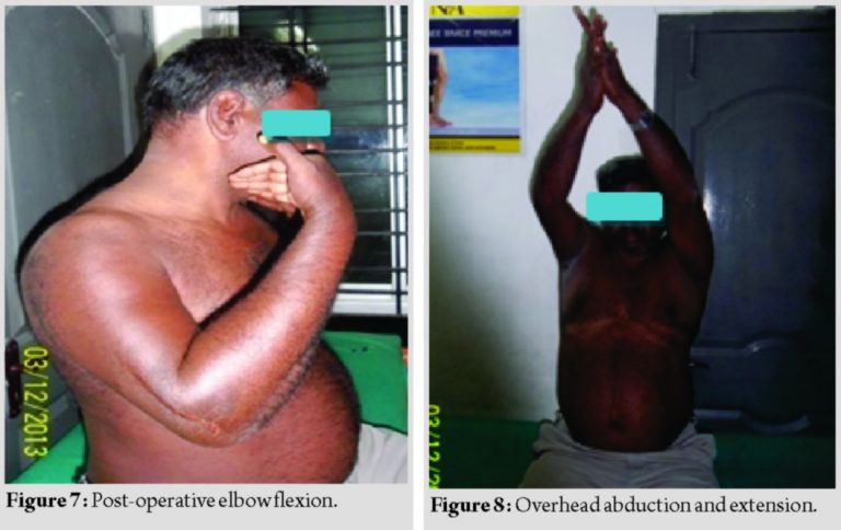 The patient followed a regular follow-up with elbow range of motion exercises as pain tolerated. Strengthening exercises were avoided. The patient cautioned not lifting more than 1 lb for 3 months and after surgery not >5 lb with an operated arm.
