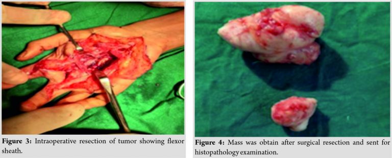 The patient was investigated with a plain radiograph (Fig. 2), which showed soft-tissue shadow of the mass and scalloping of underling metacarpal bone over the volar cortical margin. Magnetic resonance imaging was done, which demonstrates encapsulated mass over flexor tendon sheath. Excision biopsy was performed by surgical removal (Fig. 3), two nodular mass measuring 6×5×3 and 2.5×2.0×1.5 was removed. Both masses sent for histopathological examination (Fig. 4).