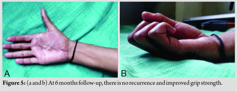 Conclusion: GCTTS of the palm is rare. GCTTS recurrences are rarer. This was a recurrence of the rare palmar GCTTS of an unusually large size with secondary contracture which was successfully managed without recurrence and improvement from pre-operative hand functions.