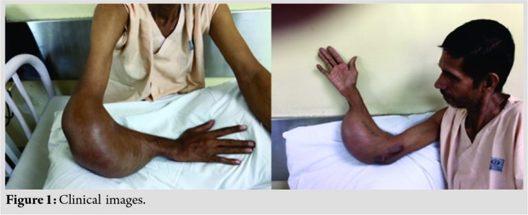 A male of a 38-year-old presented to us with pain complaints and swelling in his right elbow and forearm for the past 1 year. Pain was insidious in onset, moderate in intensity, non-radiating, gradually progressive in nature, aggravated by movement, partially relieved with rest. Initially, the swelling was localized to elbow joint extending to forearm on the past few months. No history of weight loss was there and any history of trauma but was associated with episodes of fever. On examination, the patient appeared malnourished, locally massive swelling extending from elbow to distal forearm was seen. Swelling was circumferential around the elbow joint, distally it was localized to anterolateral aspect of forearm. It was tense, with prominent veins, and was tender around the elbow but non-tender around forearm. It was soft and cystic in consistency, compressible, with positive fluctuation. Movements around elbow joints were limited (Fig. 1).