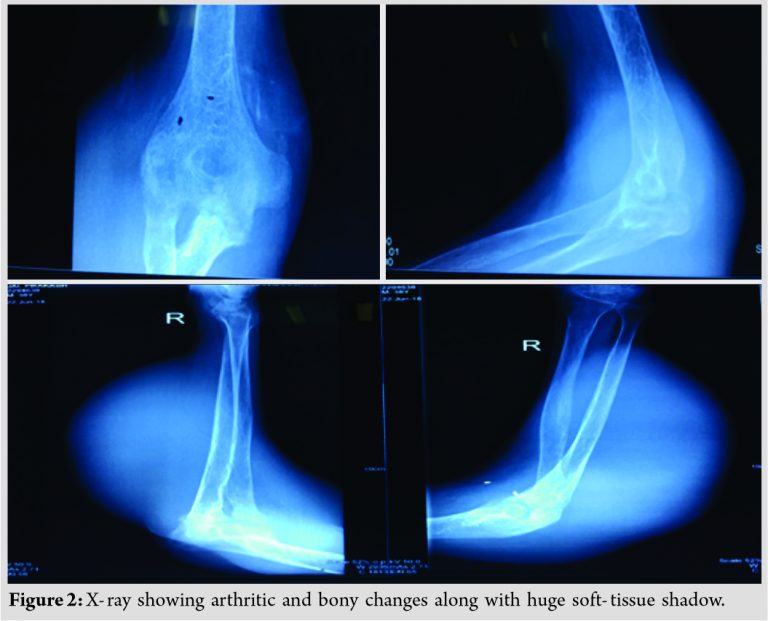 Distal neurovascular status was intact. Blood picture revealed raised lymphocyte count with raised erythrocyte sedimentation rate. Radiologically, X-ray of elbow joint showed arthritic changes along with multiple ill-defined no sclerotic lytic lesion involving humeral condyles, olecranon process of ulna, and radial head along with large soft-tissue shadow (Fig. 2).