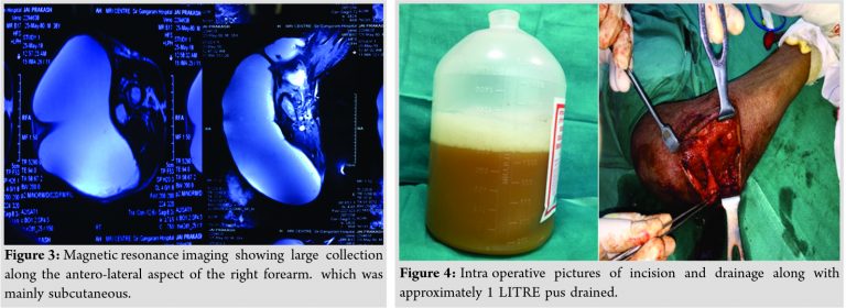 MRI was suggestive of large collection along the anterolateral aspect of the right forearm which was mainly restricted to subcutaneous plane (Fig. 3).Incision and drainage of the swelling was done under GA. Intraoperatively, the swelling was filled with purulent exudates of around 1 L in volume (Fig. 4).