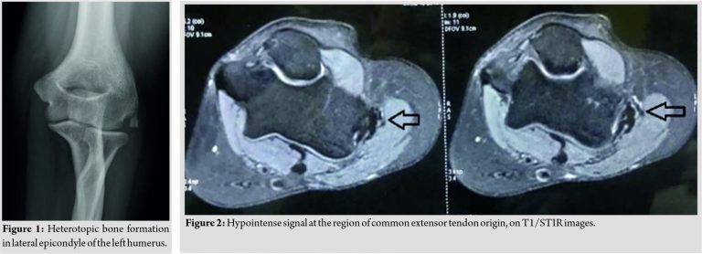 A 39-year-old female (right hand dominant) presented with the left elbow pain for the past 1 year. There was no history of any associated injury to the elbow. Local examination revealed tenderness over the lateral epicondyle of humerus and Cozen’s test was positive, suggesting the clinical diagnosis of lateral epicondylitis of the elbow. The plain radiograph showed heterotopic bone formation, in the region of lateral humeral epicondyle (Fig. 1). Magnetic resonance imaging (MRI) revealed hypointense signal at the region of common extensor tendon origin, on T1/STIR images (Fig. 2). Non-contrast computed tomography (NCCT) showed a well-corticated calcified density at the common extensor tendon origin in the proximity to the lateral humeral epicondyle common extensor tendon origin (Fig. 3), suggestive of calcific common extensor tendinosis. Since there was a bony mass noted around the lateral epicondylar region of the elbow, the CT and MRI scans were done to rule out the extent and characteristic of this lesion and to rule out any sinister pathology like malignancy.