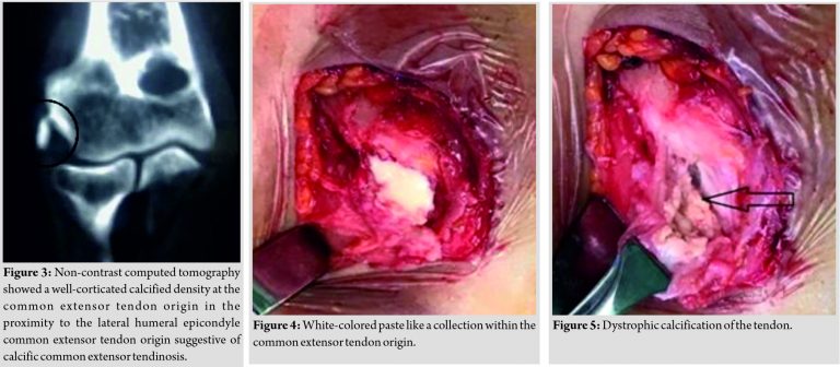 Keywords: Calcific tendonitis, Elbow, Lateral epicondylitis, common extensor origin, tennis elbow, dystrophic calcification.