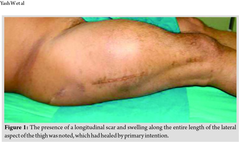 A 70-year-old gentleman presented with a painless swelling in the right thigh for 7 months, which was spontaneous. He had a history of femur shaft fracture, for which open femur nailing was done 10 years ago. Postoperatively, he had uneventful wound healing and fracture union. He has no recollection of any complications following the surgery and was able to walk full-weight-bearing without any aid. Clinically, he had a large diffuse swelling on the anterolateral aspect of the right thigh which was around 10 cm × 8 cm. The swelling was firm, non-tender, and non-pulsatile, with ill-defined margins. The presence of a longitudinal scar along the entire length of the lateral aspect of the thigh was noted, which had healed by primary intention (Fig. 1). The right hip and knee movements were normal. Routine hematological tests were done, including erythrocyte sedimentation rate and C-reactive protein. All the blood reports were normal.