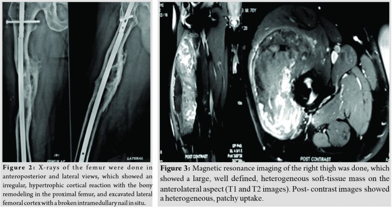 X-rays of the femur were done in anteroposterior and lateral views (Fig. 2) which showed an irregular, hypertrophic cortical reaction with the bony remodeling in the proximal femur and an excavated lateral femoral cortex with a broken intramedullary nail in situ. Magnetic resonance imaging (MRI) of the right thigh was done, which showed a large, well defined, and heterogenous soft-tissue mass on the anterolateral aspect (T1 and T2 images). Post-contrast images showed a heterogeneous and patchy uptake (Fig. 3). These findings were consistent with a soft-tissue tumor. We, however, did not perform a computed tomography (CT) scan for this patient.