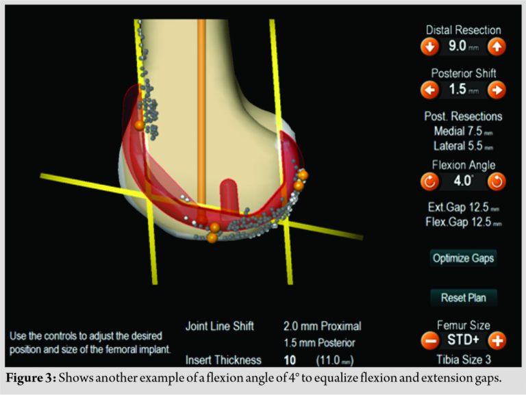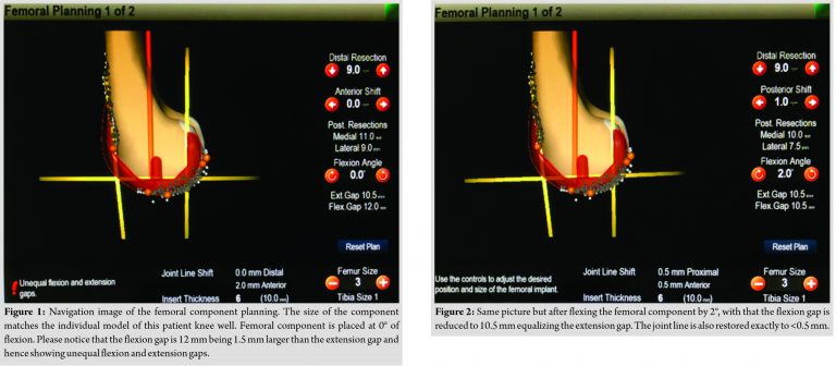 One in five patients is not happy with the results of total knee replacement [1]. Probable causes of pain are instability [2]- due to unequal flexion and extension gap, failure to restore sagittal diameter resulting in over stuffing or flexion instability, failure to restore mediolateral diameter resulting in overhang or under hang, anterior femoral notching, and patellofemoral/extensor mechanism issues. Simulation studies have proven that theoretically, flexion of the femoral component is one solution to tackle all of the above issues [3,4,5]. Instability due to mismatch between flexion and extension gap is the most common cause for early failure of total knee replacement [6]. The most common scenario for instability is a loose flexion gap (flexion gap is more than extension gap) where the options available to the surgeon are, option one is to either up size the femoral component which in a posterior referencing system [7,8,9] it causes over stuffing of patellofemoral joint and results in anterior knee pain, in anterior referencing system up sizing causes over stuffing of the flexion gap resulting in reduced range of movements and stiffness, in both systems increases mediolateral diameter resulting in overhang and causes irritation of capsule, Ilio-Tibial Band, collateral ligaments resulting in pain. In addition, need for posterior femur augments increases the cost to the patient. Option two is to posteriorize the femoral component, but it can result in femoral notching and can cause periprosthetic fracture. Option three is to increase extension gap too by cutting more distal femur and using thicker poly, but it results in joint line elevation and mid-flexion instability, especially in cruciate retaining knees where posterior cruciate ligament becomes lax or dysfunctions if the joint line becomes elevated [10]. We opted for option four of flexion of the femoral component, which has been proven theoretically in simulation studies [3,4,11] to reduce the flexion gap by 1 mm for every 2° flexion of the femoral component. The purpose of this study was to analyze whether flexion of the femoral component is helpful in adjusting the flexion gap equal to the size of the extension gap, whether it is helpful in restoring the sagittal diameter by applying a navigated, gap balanced technique, how much flexion of the femoral component is ideal in Indian population and to find out the incidence of femoral notching.