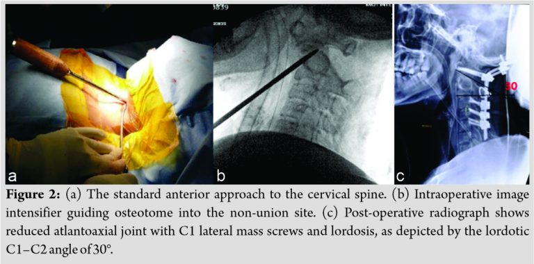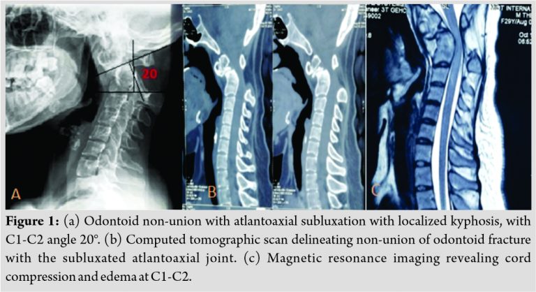 A 28-year-old female presented to the emergency department with neck pain, difficulty in balance while walking, and restricted neck range of motion for the past 6 months. She was a diagnosed case of AS not under regular follow-up. She had sustained injury to her neck, 1 year back due to a fall which was managed conservatively. On examination, she had near-complete restriction of neck movements and weakness of her right-hand grip, Medical Research Council (MRC) Grade 3. Rest of the myotomes of the upper lims and lower limbs scored MRC Grade 5. She also had signs of cervical myelopathy,that is, exaggerated deep tendon reflexes, spasticity in the both upper and lower limbs, Hoffman’s and Babinskis signs were positive and the patient was unable to walk tandem. Sensations in both upper and lower limbs were normal. Her bowel and bladder habits were normal and modified Japanese Orthopedic Association score was 15. Radiographs revealed a fixed anterior subluxation of the atlas over the axis and kyphosis of 20° between C1 and C2 (Fig. 1a). CT scans revealed non-union of Type II odontoid fracture with subluxation and arthritis of the atlantoaxial joint (Fig. 1b). CT also demonstrated ankylosis of the occipitocervical joint and the facet joints of the subaxial cervical spine. MRI revealed cord compression at the craniocervical junction and cord edema at C1-C2 level (Fig. 1c). CT angiography revealed normal flow in both the vertebral arteries.