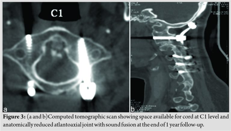 The patient was then positioned prone using the Mayfield’s clamp. The adequate reduction was ensured under fluoroscopic guidance. The standard posterior approach was performed to expose the atlantoaxial and occipitocervical region. C1-C2 joint was curetted, wedge-shaped bone graft was placed and fusion performed along with posterior fusion from occiput to C5 using occipital plate and lateral mass screws at C1, C3, C4, and C5. C1-C2 joint was reduced using DCER (distraction, compression, extension, and reduction) technique; hence, decompression was deferred as joint was reduced anatomically [8]. Sublaminar wires were used at the C2 lamina. The construct was stabilized with pre-bent rods. Posterior fusion was performed using cancellous graft chips obtained from the right posterior iliac crest (Fig. 2c). The post-operative period was uneventful, and the patient was advised to use the soft cervical collar for 3 months. By the end of 3 months, she recovered significantly from her myelopathic symptoms. CT scan performed at the end of 1 year demonstrated a well-reduced atlantoaxial joint adequate space available for cordand a maintained cervical sagittal alignment with sound fusion at C1-C2 joint (Fig. 3a and b).