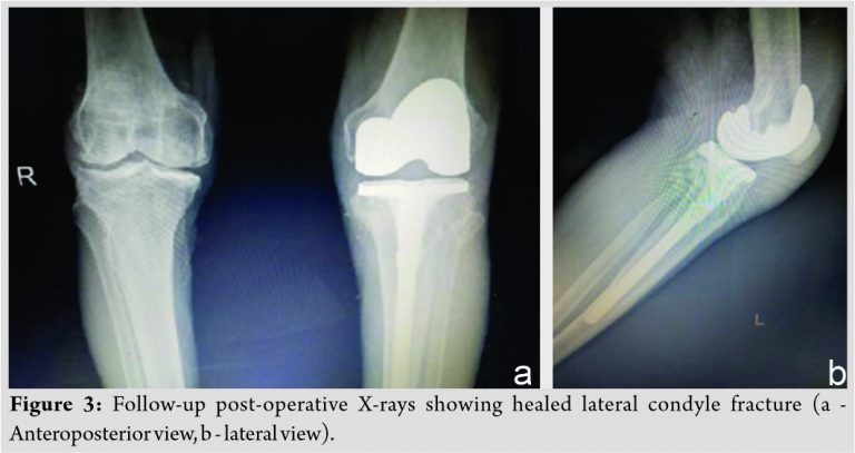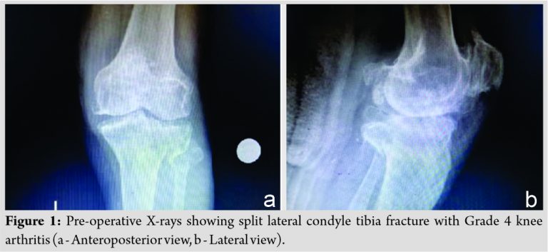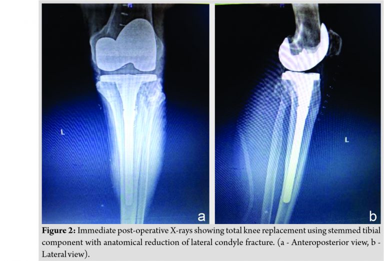 Conclusion: Primary TKR is a viable alternative treatment option compared to ORIF in elderly patients with preexisting osteoarthritis with tibial condyle fractures. It helps in early mobilization, weight-bearing and avoids secondary surgical procedures.