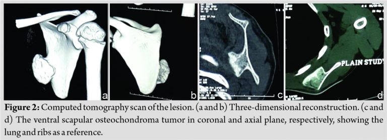 In a study of 1853 cases of bone cancer, scapula had a share of 3.6% [7]. Osteochondroma is a type of benign cartilaginous tumor [8]. It is the most common benign bone tumor [9]. It commonly involves metaphyses of long bones around knee and proximal humerus [10]. Such parts make up to 90% of occurrence site [5]. Flat bones such as scapula and pelvis are rare sites [5]. Osteochondroma has involved scapula in 3.0–4.6% of all reported cases and comprise 14.4% of all tumors of scapula [11]. It is the most common benign primary bone tumor of scapula [12].
