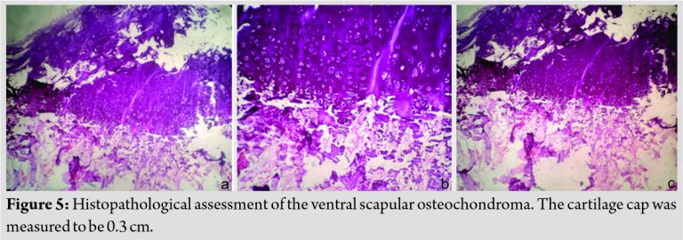 A working diagnosis of VSO was made. Excision of lesion was principally done for mechanical reasons and secondarily for pathologic assessment. It was done under general anesthesia with patient in prone position. Shoulder was rotated internally, which helped lift medial border of scapula. A 5 cm incision was given along inferomedial border. A muscle splitting approach of trapezius and rhomboid was used. En bloc excision of VSO was done. To prevent complications, meticulous dissection was done and hemostasis was obtained. It was removed as a single block to prevent seeding. No remnants were left. Sessile VSO of 3 × 3 × 1 cm3 was sent for histopathological assessment. The tumor was hard. It was composed of bone covered by a thick cartilage cap, as shown in (Fig. 3, 4). Thorough irrigation was done and the wound was closed in standard fashion. The surgery was over in 45 min.