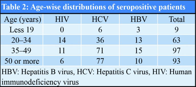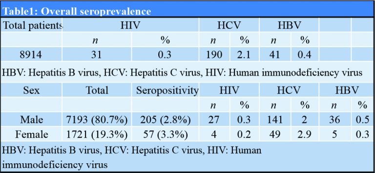 Materials and Methods: This retrospective study was carried out in author’s institute on indoor patients admitted from January 2015 to December 2017. A total of 8914 patients were included in the study and relevant clinical data were collected for seropositivity of hepatitis B virus (HBV), hepatitis C virus (HCV), and human immunodeficiency virus (HIV) in patients admitted in the orthopedic emergency department. These patients were routinely tested for seropositivity before undergoing various surgical procedures.