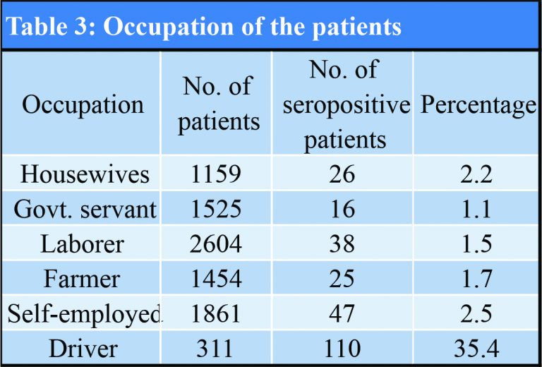 A total of 8914 patients were included in the study, out of which 7193 (80.7%) were male and 1721 (19.3%) were female. Out of total patients, 262 (2.9%) were found to be seropositive. Out of 262 patients, 31 (11.8%) were found to be positive for HIV, 190 (72.5%) for HCV, and 41 (15.7%) for HBV. Details of data are shown in Table 1. It has been observed that 190 (72.5%) of the seropositive case had an age above 35 or more (Table 2). Table 3 shows the occupation of patients included in the study with highest prevalence of seropositivity found in drivers 35.4% (110/311 patients) followed by self-employed 2.5% (47/1861 patients) followed by farmer (1.7%) and laborers (1.5%). This prevalence could be attributed to high-risk behavior of unsafe sex associated with such occupation, especially in drivers, level of awareness education, and unsafe medical practice in rural areas such as syringe sharing and intravenous (IV) drug abuse.