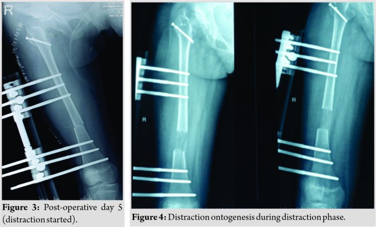 Care was taken to preserve the piriformis attachment on to main femoral fragment. With the help of patella holding clamp, the GT fragment was held and shifted to 2 cm distally and fixed with two 4 mm cannulated cancellous screws. The wound was closed over the suction drain and the patient was then planned for monorail external fixator in the supine position. Gradual distraction was started from the 5th post-operative day (Fig. 3).