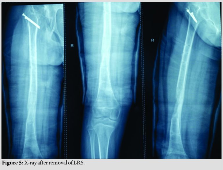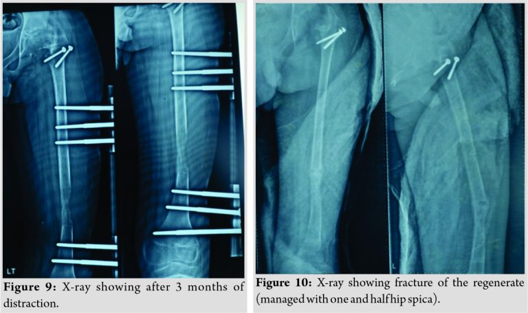 The actual follow-up 10 months following index surgery. The lengthening procedure was carried out for almost 4 months, with 6 months of further follow-up following fixator removal. Any complications such as pin-tract infection or fracture of the regenerate usually happen during the first 6 months of following fixator removal. This case has no such complication during this period another possibility of further growth of femur is also negated us the patient is approaching 14 years of age. Hence, 6 months of follow-up are adequate to see the outcome.