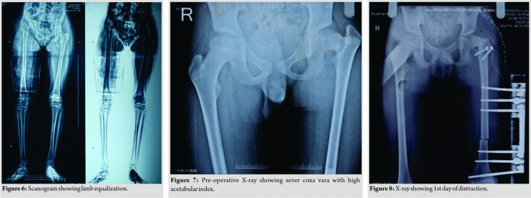 Careful follow-up evaluation was done and distraction was stopped once limb length equalization was achieved (Fig. 4-6). The fixator was removed after 112 days. The patient had no complication postoperatively except mild pain during early phases of distraction which was managed with high-dose analgesics and knee stiffness in the later part of the distraction. She achieved a complete range of motion of knee with extensive physiotherapy and quadriceps strengthening exercises. At final follow-up of 6 months, the patient had no equinus at the ankle with improvement in hip abduction with minimal abductor lurch.