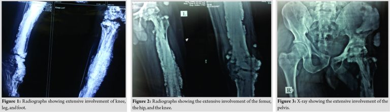 There was a flexion deformity of 30° of the knee and equino cavo varus deformity of the foot and the ankle. There was a limb length discrepancy of 7 cm. The patient was ambulatory without any walking aid. There was no sensory loss. Laboratory tests, including complete blood count, erythrocyte sedimentation rate, C-reactive protein, serum calcium, phosphorus, and alkaline phosphatase, were within normal limits. Other tests, including renal function tests, liver function tests, T3, T4, thyroid-stimulating hormone, and parathyroid hormone, were normal. X-rays characteristically showed dense sclerotic nodular, hyperostotic lesions involving the pelvis, femur, tibia, fibulae, and the 1st and 2nd toes. Knees and ankle also showed intra-articular/para-articular involvement. Such an extensive involvement right from the pelvis to toes, including the knee and ankle, has not been reported before. The X-rays did not precisely fit into any of the patterns described in the literature; rather they were of the mixed type.