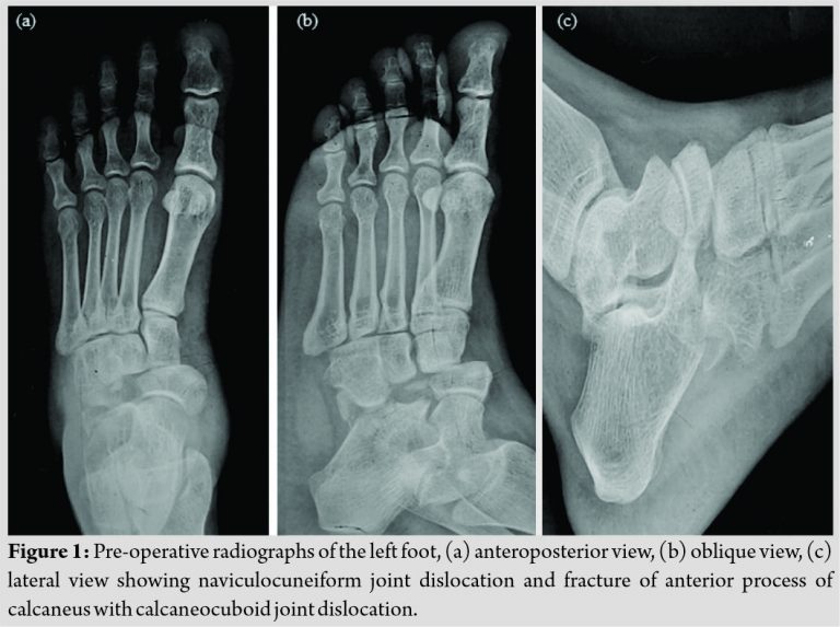 Injuries involving midfoot are rare and comprise only 5% of all foot injuries. Among these, the most common midfoot injuries are the fracture–dislocation of Chopart and Lisfranc joints [1]. Dislocations involving calcaneocuboid and talonavicular joint or isolated dislocations of calcaneocuboid, talonavicular, or naviculocuneiform joints are very rare [2]. Midfoot injuries predominantly occur in motor vehicle collisions [3]. However, dislocation of naviculocuneiform and calcaneocuboid joint following low-energy injury has been infrequently reported in the literature. This case report presents the diagnosis and management of a patient with dislocation involving naviculocuneiform and calcaneocuboid joint, which is an unusual injury.