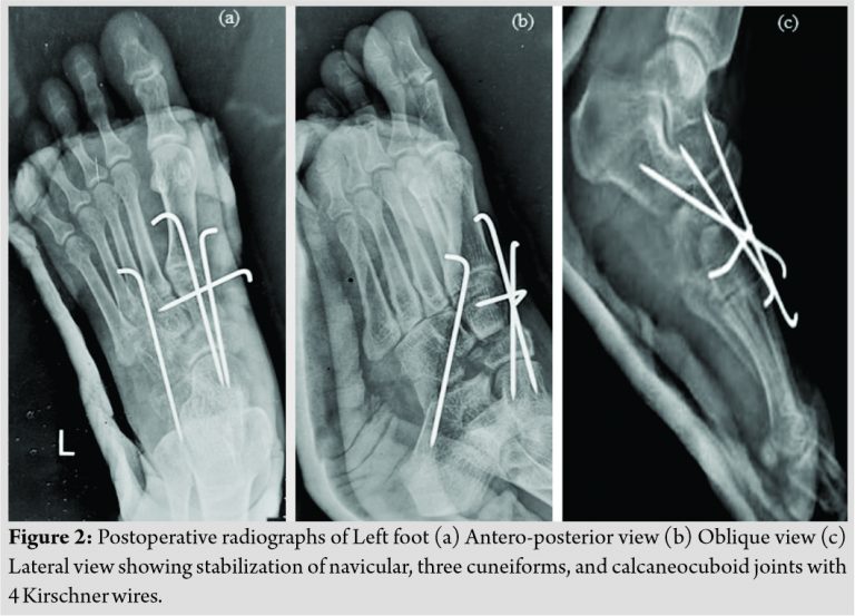 Closed reduction under anesthesia was attempted by traction and manipulation of midfoot, but it was not successful. Hence, open reduction and internal fixation with K-wire was planned. Calcaneocuboid and naviculocuneiform joints were approached with the help of two mini-open incisions 3 cm (dorsolateral) and 4 cm (dorsomedial), respectively, over midfoot. There was a disruption of interosseous ligament and medial naviculocuneiform joint capsule. The soft tissues entrapped between calcaneocuboid and naviculocuneiform joints were removed. Using axial traction in line with 1st metatarsal and adduction of midfoot, navicular was reduced. After confirming congruent reduction with the help of an image intensifier, two parallel, 2 mm K-wires were passed through medial cuneiform and navicular into the talus. A transverse K-wire was passed through medial cuneiform into middle cuneiform to give complete stability to the medial column. For the lateral column, a 2 mm K-wire was passed from cuboid to calcaneal head. Postoperatively, ankle and foot were immobilized in the below-knee slab posteriorly (Fig. 2).