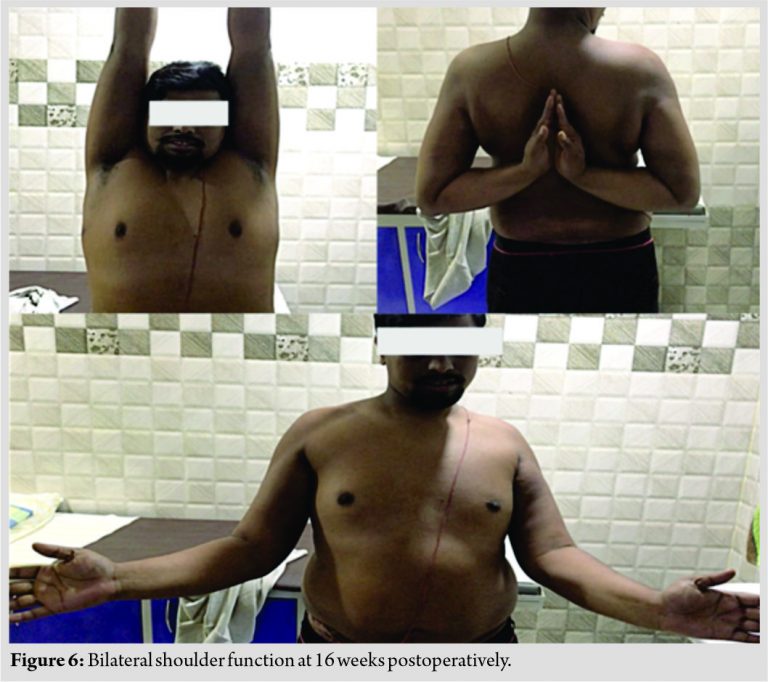 At 2 weeks post-fixation, both shoulders remained congruently reduced. While the right greater tuberosity fracture remained stable, the tuberosity fracture in the left shoulder had displaced (Fig. 3). Resuturing was done under anesthesia and the fixation was reinforced with 4 mm cannulated cancellous screws (Fig. 4). The greater tuberosity fracture had split into two fragments. Fixation was assessed under fluoroscopy and was found to be stable with movements of the shoulder. The patient was advised arm sling for both shoulders for 6 weeks, with an additional small abduction pillow on the left. Internal rotation was delayed for 4 weeks on the left shoulder. Pendulum exercises were started from 2 weeks postoperatively followed by active assisted and active exercises at 4 and 6 weeks, respectively. The patient recovered well. Fractures united at 8 weeks on the right shoulder and at 12 weeks on the left, and at last follow-up at 12 months, the greater tuberosity fractures had healed well and the glenohumeral joints were in situ (Fig. 5). He had achieved full shoulder function by 16 weeks after first surgery (Fig. 6).