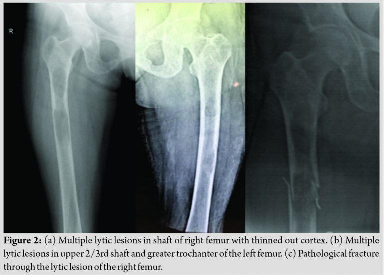 Introduction: Pathological fractures in long bones are commonly caused by simple bone cyst or Osteogenesis imperfecta in children and by metastatic tumors from primary carcinoma, multiple myeloma, osteoporosis, and bone tumors in adults. Hyperparathyroidism causing pathological fractures, though a well-known entity, is seen infrequently in clinical practice. The fractures occur in the expansile fibro-cystic bone lesions called as “Brown tumor.” The reported case describes a patient with classical features of primary hyperparathyroidism (PHPT) having multiple lytic lesions in pelvis and bilateral femur with pathological fracture. It is being reported due to its rarity.