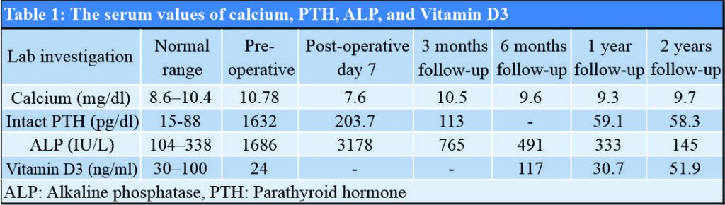 USG of neck suggested the possibility of parathyroid adenoma of size 37 mm × 19 mm. Contrast-enhanced CT scan of neck showed well defined heterogeneously enhancing nodular mass lesion of size 33 mm × 24 mm × 23 mm just posterior to the right lobe of thyroid, suggestive of parathyroid adenoma with lytic lesions in the base of skull and in the right occipital bone. USG-guided fine-needle aspiration cytology from lytic lesion over right iliac crest showed only hemorrhagic background without any cellularity. Patient’s complete blood count, erythrocyte sedimentation rate, C-reactive protein, rheumatoid factor, and urine examination were normal. She had hypercalcemia and hyperparathyroidism with serum calcium level of 10.78 mg/dl, PTH 1632 pg/dl, ALP 1686 IU/L, and Vitamin D3 24 ng/ml. Serum calcium, PTH, ALP, and Vitamin D3 levels done on various occasions are summarized in [Table 1].