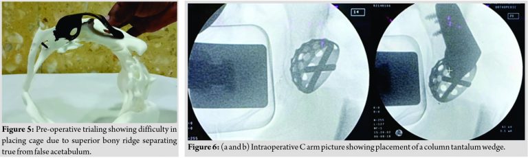 On the 3D model, a false acetabulum just superior to true acetabulum was noted; both acetabula being separated by a bony ridge. True acetabulum showed a breached medial wall, along with deficient posterosuperior wall and column defect. Pre-operative trialing was done using a Bursch Schneider cage of appropriate size on the 3D model of true acetabulum(Fig. 5). However, due to the presence of superior bony ridge between true and false acetabula, superior iliac flange of cage could not be seated over it properly. Hence, option of reconstruction of acetabular defect with tantalum posterior column wedge, tantalum cup, and tantalum augments was entertained.