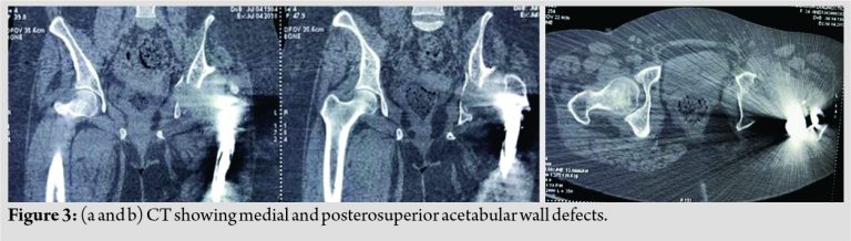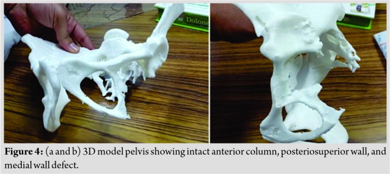 On the basis of CT of affected hip, which showed defects in medial and posterosuperior wall of true acetabulum (Fig. 3) a pre-operative 3D CT model of affected hip was printed to accurately assess the underlying acetabular defects and to see which acetabular reconstruction option worked best in current scenario (Fig. 4).