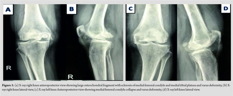 A 45-year-old female patient presented to us with pain in both the knees since 1 year. She also had difficulty in walking. Pain had gradually increased over the period of 1 year. She had no history of the previous trauma, steroid use, meniscus surgery, alcohol intake, or smoking. Physical examination revealed local tenderness over MFC and medial tibial condyle and decreased range of motion. Laboratory investigations showed no specific findings. Subchondral fracture with articular surface collapse of MFC with joint space narrowing and varus deformity was seen on X-ray in both the knees. Sclerosis was seen on X-ray in the medial tibial condyle on both the sides. X-ray of both knees revealed SPONK in Koshino’s Stage IV and Carpintero’s Stage IV (Fig. 1).