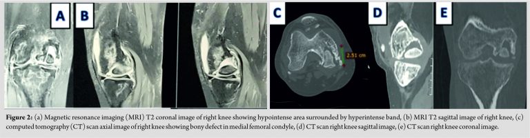 MRI of right knee showed characteristic focal hyperintense areas surrounded by band like hypointense areas in both MFC and MTP which was suggestive of subchondral collapse with ill-defined bone marrow changes (Fig. 2).