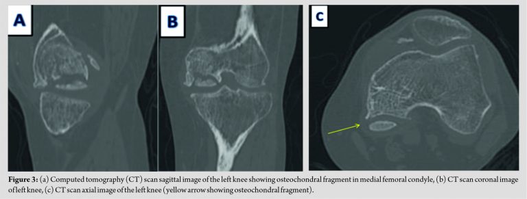 Computed tomography (CT) scan of both knees was done to assess the deformity. Right knee showed a defect measuring 2.51 cm in the MFC (Fig. 2). Left knee CT scan also showed defect in MFC (Fig. 3).